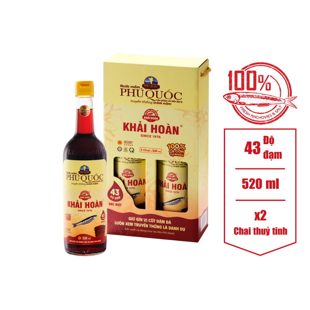 Nước mắm 43 độ đạm 520ml Khải Hoàn được làm từ cá cơm than Phú Quốc và muối biển Bà Rịa Vũng Tàu, ủ chượp hoàn toàn tự nhiên trong thùng gỗ bời lời thiên nhiên từ 12-15 tháng theo phương pháp truyền thống, quản lý chất lượng theo tiêu chuẩn HACCP từ khâu đánh bắt đến thành phẩm. Sản phẩm có lịch sử hình thành hơn 200 năm, được bảo hộ Chỉ dẫn địa lý trong nước và 28 nước Liên minh Châu Âu và hiện tại sản phẩm đã được Bộ văn hóa thể thao công nhận là di sản văn hóa phi vật thể, Tri thức dân gian cấp quốc gia.