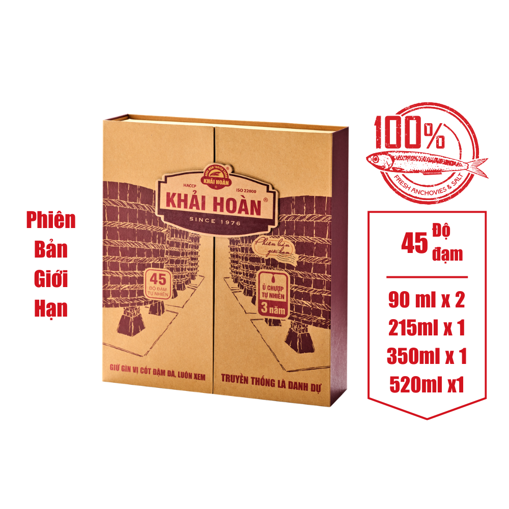 • Nước mắm Phú Quốc Khải Hoàn Phiên bản đặc biệt: 45 độ đạm dung tích 90ml. Sự đặc biệt đến từ chất lượng hoàn hảo, câu chuyện đẹp đẽ, và sự yêu thương của người tiêu dùng.